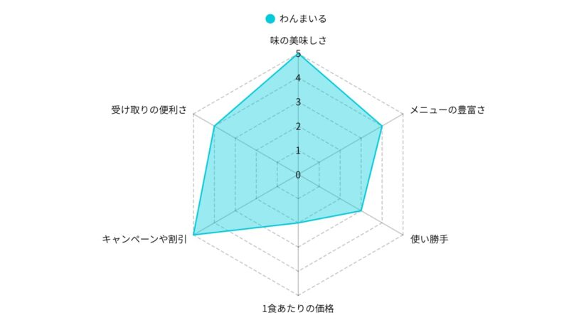 | 商品 | 味の美味しさ | メニューの豊富さ | 使い勝手 | 1食あたりの価格 | キャンペーンや割引 | 受け取りの便利さ |